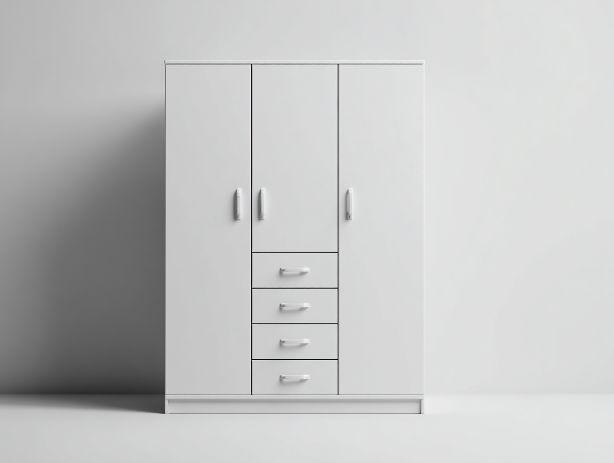 Der Schrank bietet ausreichend Stauraum für Kleidung und Haushaltsartikel. Die Türen ermöglichen einen einfachen Zugriff auf den Innenbereich. Der mittlere Stauraumbereich unterstützt eine strukturierte Aufbewahrung von kleineren Gegenständen und erleichtert die Organisation im Alltag.