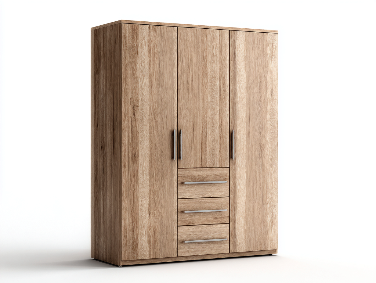 Dieser Kleiderschrank mit drei Türen bietet eine funktionale Lösung für die Aufbewahrung im Schlafzimmer. Die natürliche Holzoptik verleiht dem Möbelstück eine warme Ausstrahlung und lässt sich gut mit modernen sowie wohnlichen Einrichtungskonzepten kombinieren.